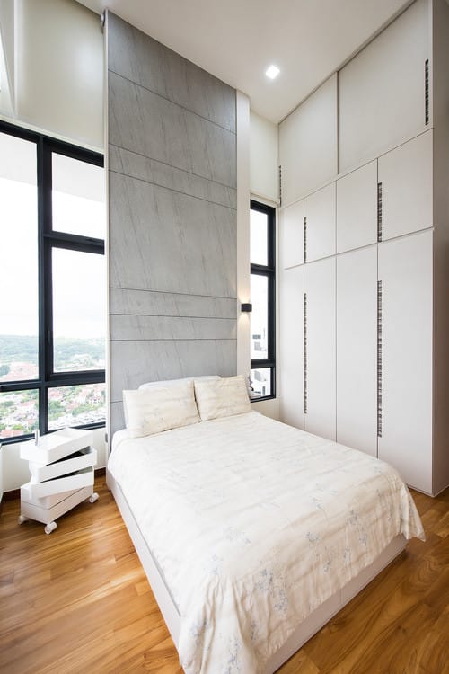 Nothing beats a tasteful addition of calming elements to your home. And for that much-needed tone of tranquility, this towering wall of grey brings a touch of refined industrial appeal to this bedroom space. With a hint of texture and striking sharp lines, the floor-to-ceiling accent elevates the grand aura of this contemporary bedroom.
