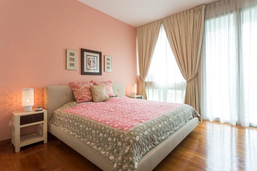 Design is all about the details, especially with this elegant pink-and-white bedroom. Set in feminine tones, the comfortable bed set-up adds interest to the pale pink wall behind it, which makes a welcome complement to the glossy wooden floor.