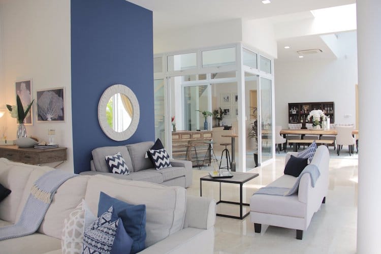 Add a modern, playful flair into your home with a splash of majestic lavender to enhance the space's mood. The foyer of this interior, designed by Areteculture SG, makes an inviting seating area, thanks to the soothing and relaxing bluish-violet tones that helped magnify the height of the ceiling.