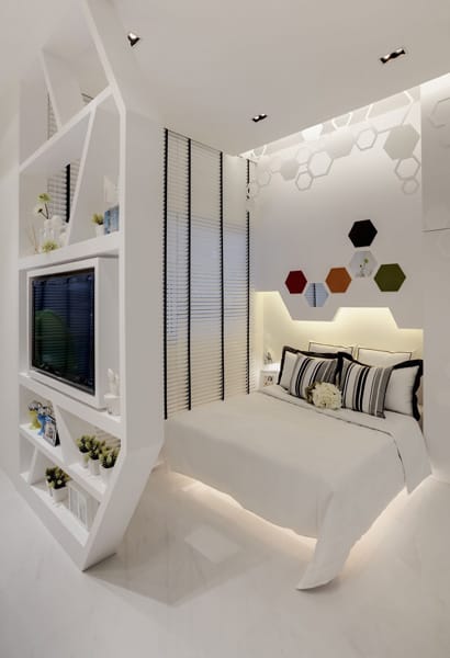 With a sprinkle of modern glamour coupled with futuristic elegance, the interior of this contemporary bedroom makes a dashing statement with its soothing white facade and funky shapes. Highlighted by the playful and faceted silhouettes above the bed, the bookshelves act as a divider between the bed and the rest of the space, benefitting from the careful selection of white to define their edges.