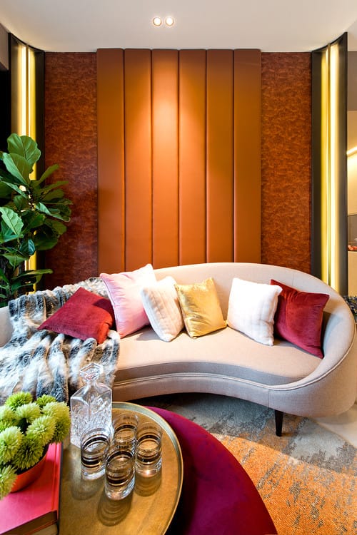 Liven up your home interior by featuring a trendy and fashionable colour-on-colour wall, as seen here. Covered in premium fabric, the orange-padded panels make an eye-catching contrast to the similarly-coloured textured wall right behind them.