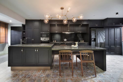 Create a bold statement for your kitchen with a dramatic all-black cabinetry. With its sensational finish and classic detailing, this modern kitchen infused with tradition is imbued with colourful floor tiles, making it an appealing show kitchen to entertain guests.