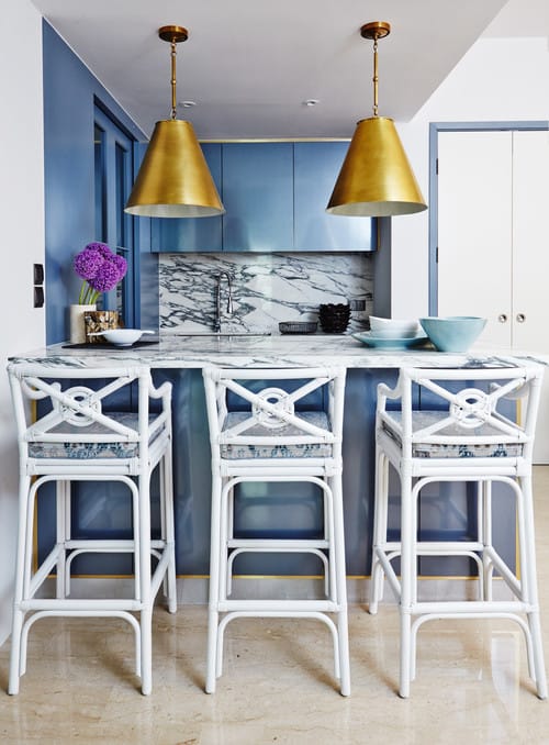 The fashionable appeal of this glossy kitchen is heightened by the stunningly chic blue walls and kitchen cabinet. Suspended lights in brushed gold make dramatic and functional accents, along with the high chairs that help pull together the kitchen's look.