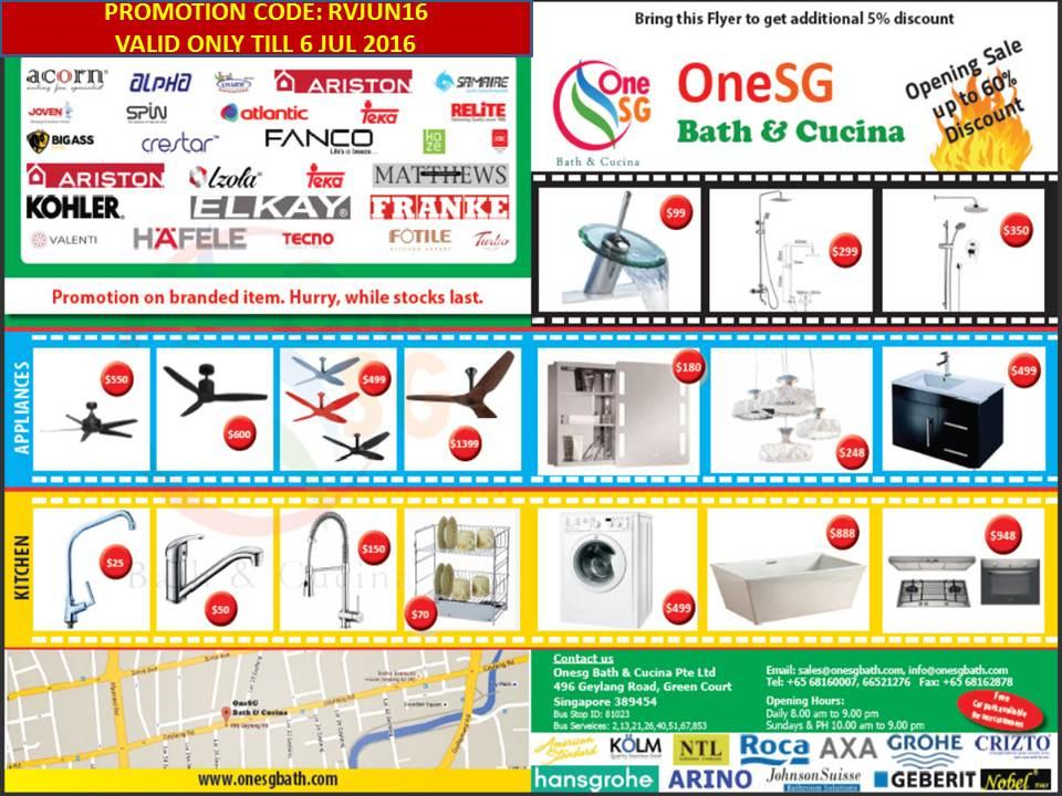 shankerp 0 Report post Posted June 14, 2016 (edited) ONESG BATH & CUCINA @ 496 GEYLANG ROADhttp://www.onesgbath.com/ ★ Massive Grand Opening + GSS + Hari Raya Sales! ★ Brand new built up showroom showcasing all the top brands ★USE #Kyoudai Promo Code: ✪RVJUN16✪ valid till 6 Jul 2016 only!!! ★Show photo of flyer with promo code OR print flyer to bring along ★ Additional discounts for: ✔New/Shifting homeowners (HDB/Condo/Landed) &✔Homes undergoing HDB Home Improvement Programme (HIP)✔Customers making Pre Hari Raya purchases ★1 x Lucky Draw chance JUST for a ✪LIKE✪ and ✪SHARE✪ https://www.facebook.com/kyoudaiexchange/posts/250270058683921 ★5 x Additional Lucky Draw chances for sending us a photo of your receipt with your details to mail.kyoudai@gmail.com by 6 Jul 2016 2359H. ★Lucky Draw Prizes up for grabs: 2 x EuropAce Garment Steamers ★Lucky Draw will be held on 7 Jul 2016 and winners will be notified via FaceBook Message. Our esteemed suppliers:#americanstandard #kolm #ntl #roca #axa #grohe #crizto #hansgrohe#arino #johnsonsuisse #geberit #nobel #acorn #alpha #amasco #ariston#samaire #joven #spin #atlantic #teka #relite #bigass #crestar #fanco#kaze #kdk #lzola #matthews #kohler #elkay #franke #valenti #hafele #tecno #fotile #turbo ✔✔✔We would also love to talk to Interior Designers, Renovation Contractors and Affiliates for purposes of business development. Do get in touch!✔✔✔ https://www.facebook.com/kyoudaiexchange/ mail.kyoudai@gmail.com +65 91691476 Edited June 14, 2016 by shankerp Insert URL Share this post Link to post Share on other sites